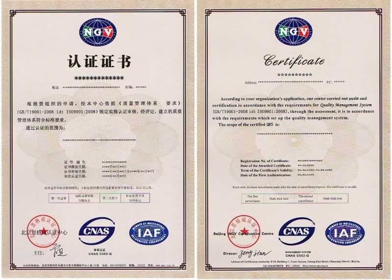 质量管理体系带CNAS标志的证书样本